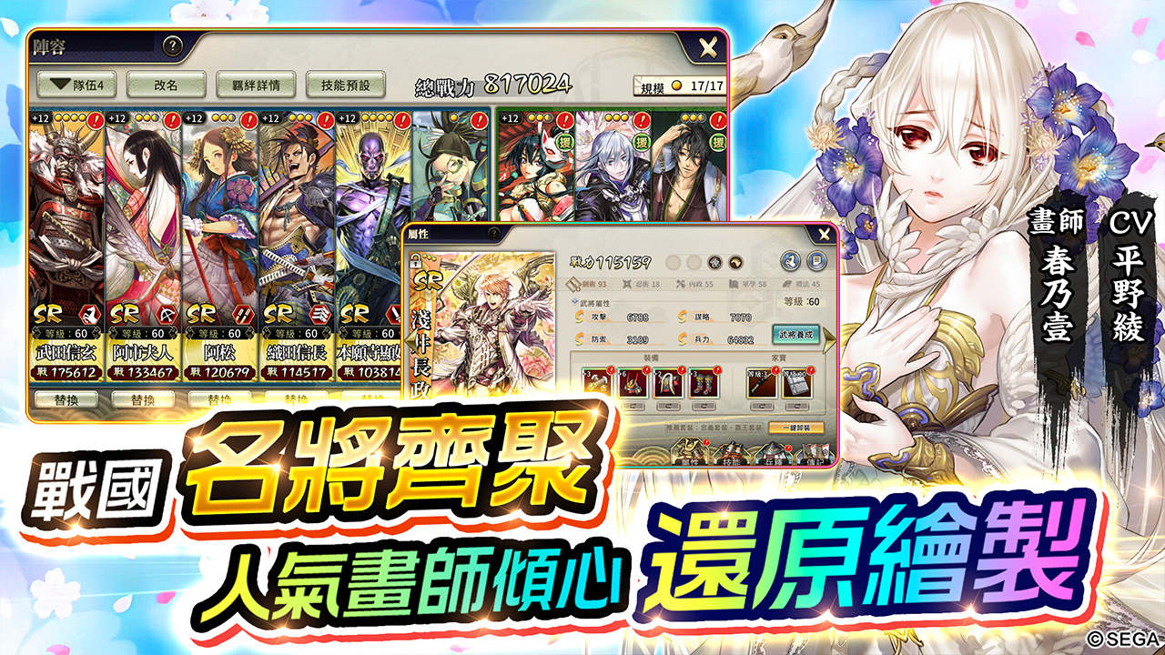 除了紧张刺激的策略战斗外,游戏内更有顶级视听盛宴等你体验。织田信长、今川义元、武田信玄等战国大名武将云集,群雄争霸上演战国风云;风间雷太、Wolfina、杉浦善夫、三好载克、Daisuke Izuka、Tony 等70 余名日本著名插画师亲笔绘制百张武将卡牌,以匠心之笔塑英杰之魂;更有顶级日本声优平野绫、斎藤千和、小野大辅、杉田智和、梶裕贵等等倾注心力,再现日本豪华历史!