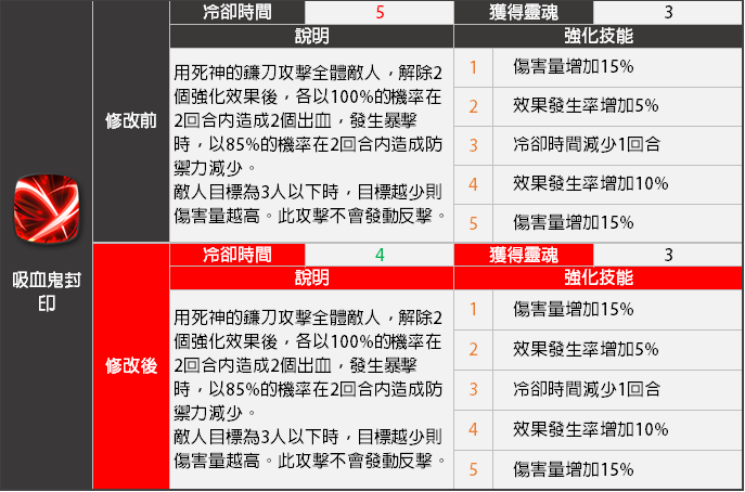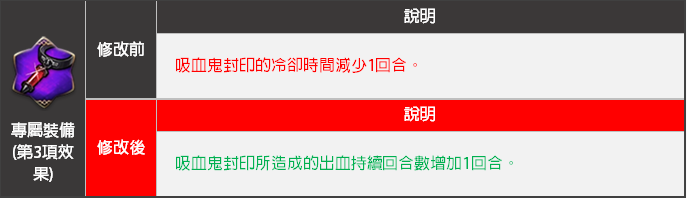 - 專屬裝備第3項效果<吸血鬼封印> 技能效果將會變更。