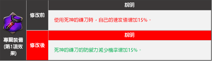 - 專屬裝備第1項效果<死神的鐮刀>技能效果將會變更。