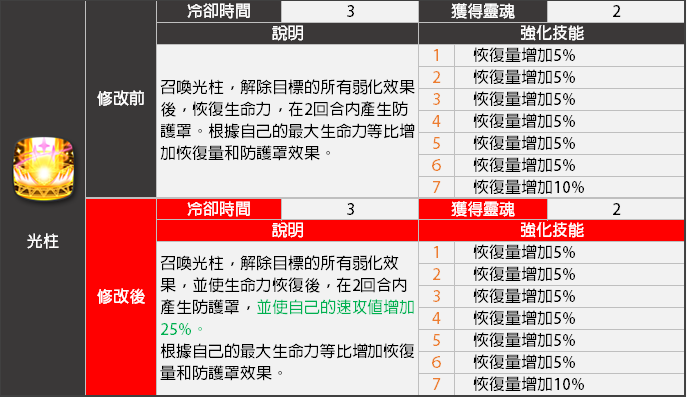 - <光柱>技能效果將會變更。