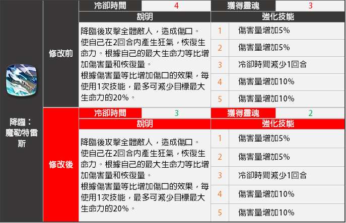 - <降臨:魔勒特雷斯>技能冷卻時間將會減少,靈魂獲得量將會變更。