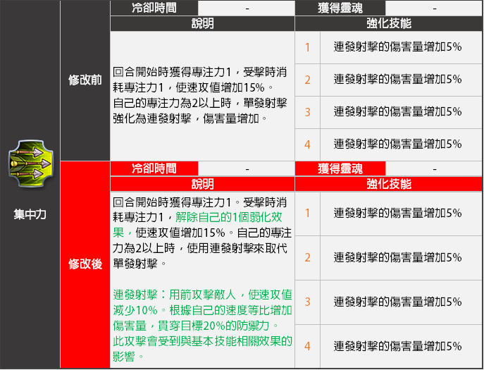 - 使用<集中力> 技能發動的「連發射擊」的傷害量將會減少。
