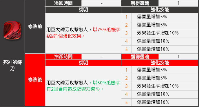 - <死神的鐮刀>技能效果將會變更。