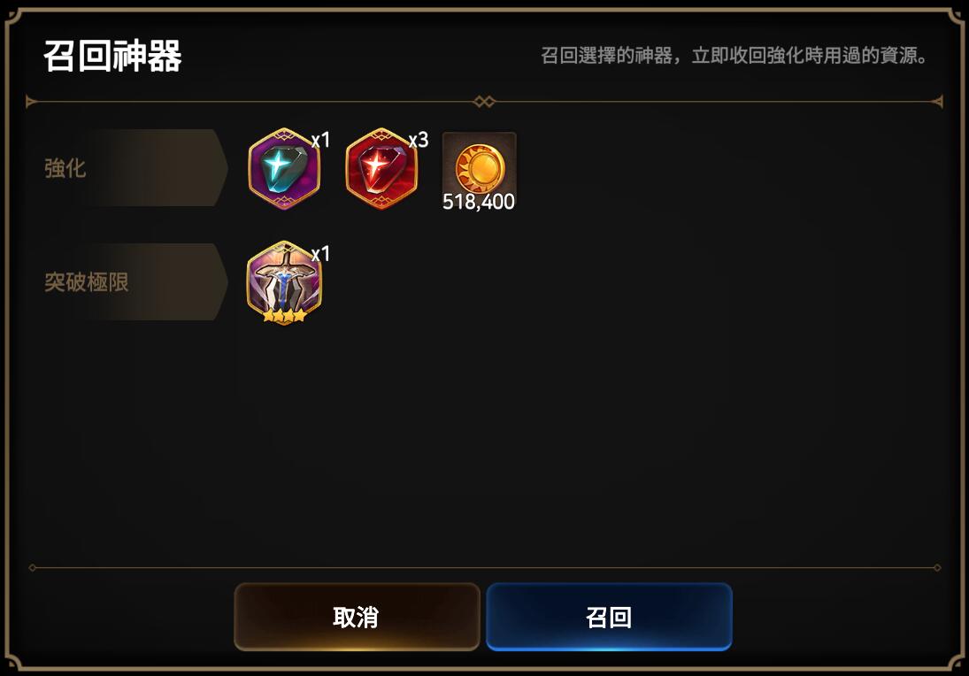 ① 召回時,將重置該神器的所有強化資訊。