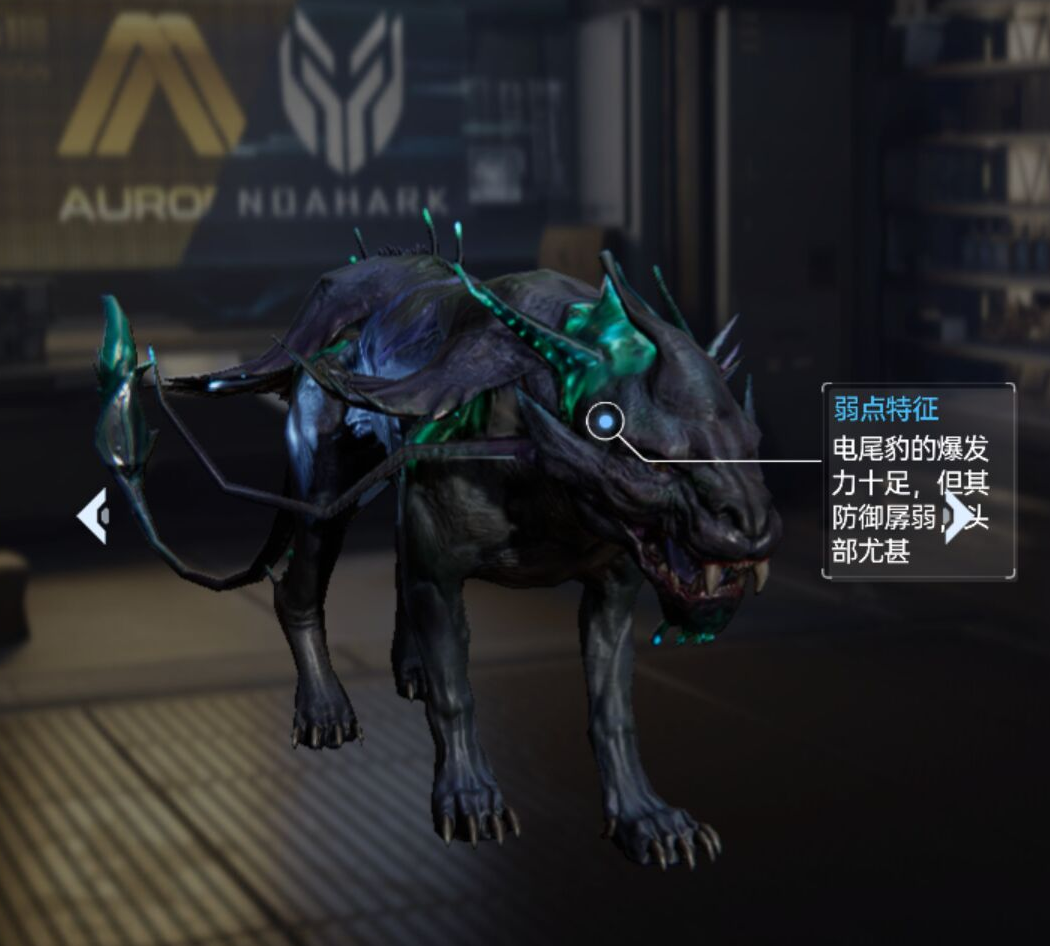战斗特性:【绝缘】受到电元素的伤害大幅降低。 电尾豹可以快速扑击向敌人,并且对敌人进行横扫。电尾豹俯下身体时要千万小心,它们充能结束后便会从尾巴射出高能电流,麻痹敌人。 | |||