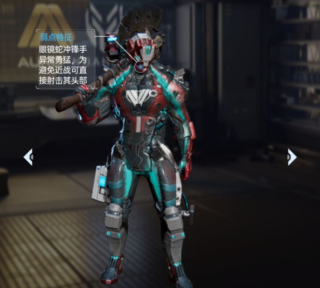 眼镜蛇冲锋手配备启明星制造的制式装备,具有充足的体系化作战经验。他们没有过多的技巧但熟知不同目标类型的弱点位置,抓住机会劈砍关键部位。冲锋手需要深入敌群,因此存活概率很低。他们清楚,害怕只会加速丧命,只有击倒敌人,才有活下去的机会。长期的清除作战使他们麻木不仁,手刃敌人不再引发恐惧,而是刺激着他们的感官。成为眼镜蛇冲锋手没有过多的资质要求,但需要士兵付出忠诚,绝对服从长官的命令,放弃人性的思考。他们只需舍命冲锋,攻破阵地,换来一线生机。