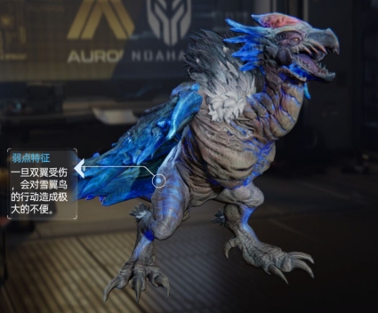 如此巨大上身形却能够凭借双翼在空中自由翱翔,可以说是被蓝蚀感染之后的奇迹,也是令各方势力都心存畏惧的恐怖生物,人们一度怀疑它是有外星文明根据自身的癖好随意拼接而成,不过好在这只能够遮天蔽日的高空掠食者并不会像普通变异生物一样遍布世界,而且极难见到。虽然外形上是一只巨鸟形态,但其健硕的肌肉与双足在陆生野兽中也是顶尖的存在。覆盖全身的蓝蚀细胞在一定程度上起到神经信息处理的作用相当于大脑的下级处理中枢,使得雪翼鸟的感知能力和灵活度异常迅捷。同时这些被科学家成为源生脑枢的细胞除了提供一部分智力担当外.本身就是一种一次性防护措施,在一部分智力担当外,本身就是一种一次性防护措施,在被一定程度的攻击后,这些组装便会软化降解一种复函泡沫的弹性物质,从而吸收并大大降低自身受到的伤害。但当这层物质被消耗殆尽时,雪翼鸟便会进入狂暴状态,攻击更如同疾风骤雨,直至将目标彻底撕碎或者至死方休。