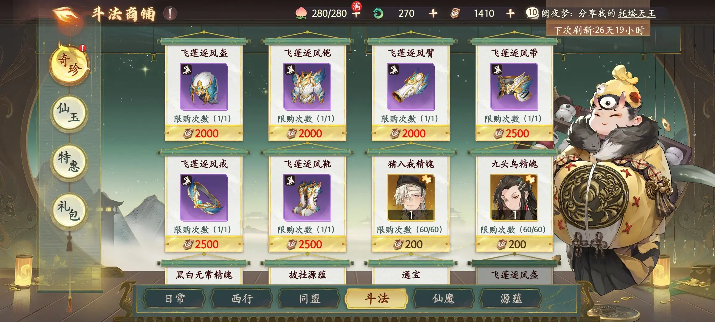 斗法商店中的货币要稍微存一点,来兑换下一个品质的速度以及比较好的输出套装,这样话只能保证套装速度不会离大部队太远。