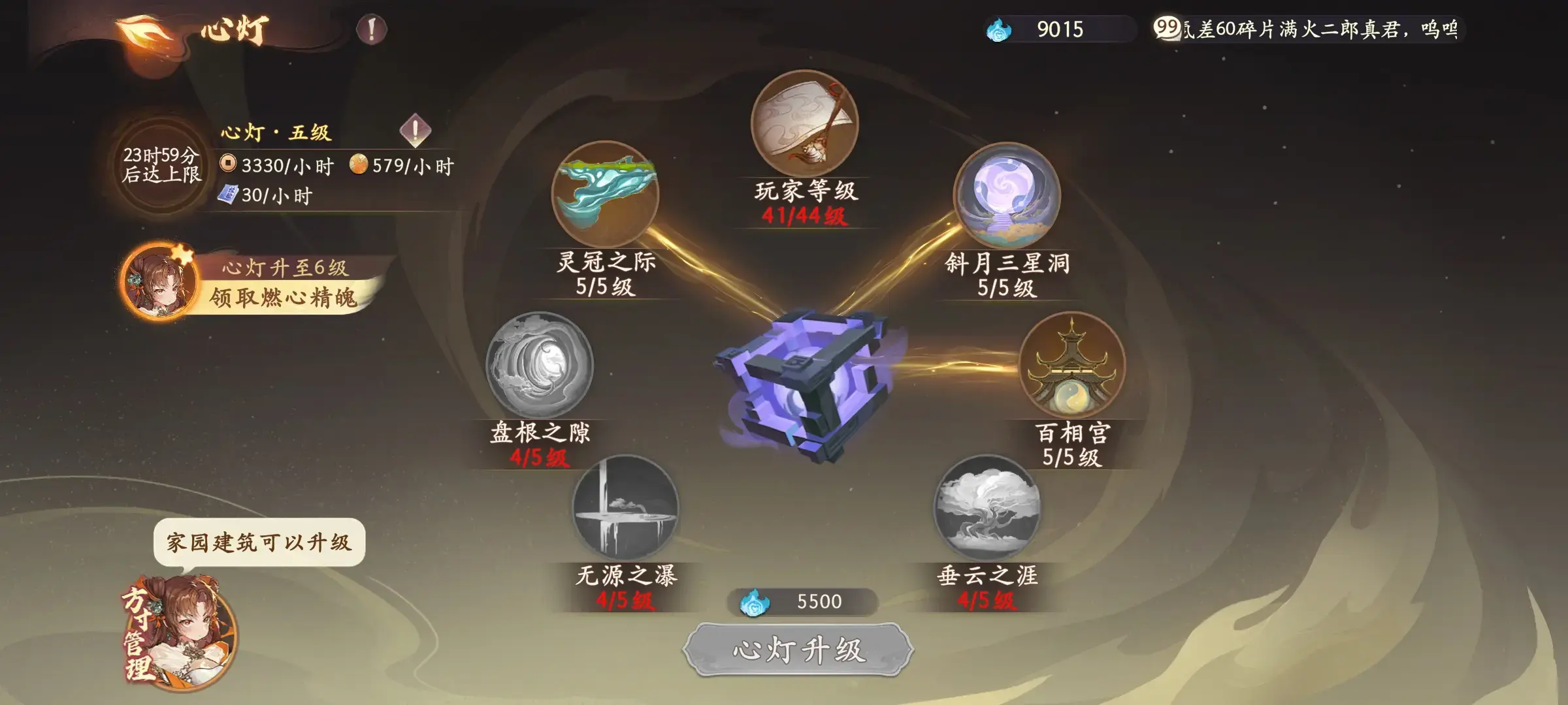 在这里我们可以通过苍碧之间来祈福奖励、灵冠之际来获得已经获得的角色碎片、心灯提升奖励获得燃心碎片,以及炼制中的各种稀缺奖励,当然家园资源的获取速度是和各建筑的等级挂钩的。