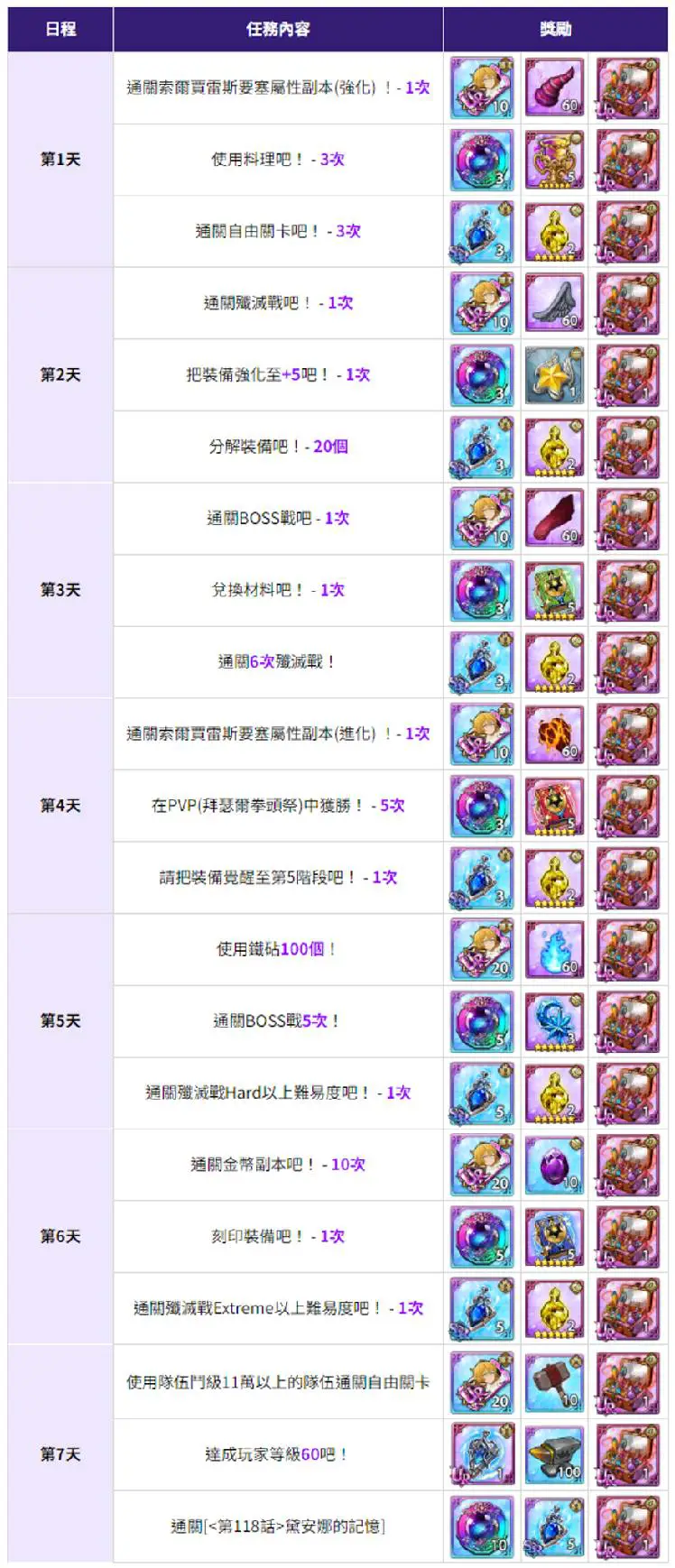 - 每日簽到時會依序開放第1天~第7天任務,且隨時可執行已開放的任務。