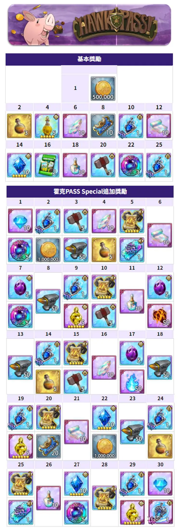 ※ 購買霍克PASS SPECIAL前所達成的等級獎勵,在購買霍克PASS SPECIAL後將即時發送。