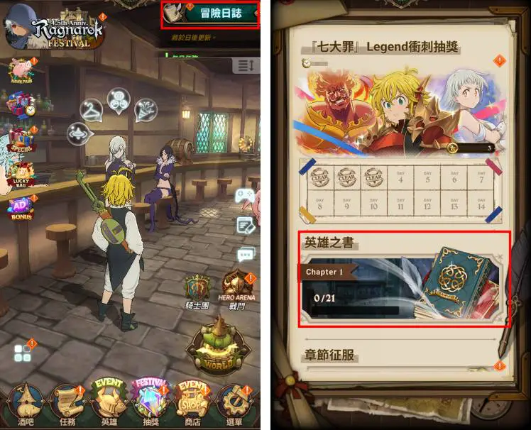 ※ '英雄之書’章節與任務不同,需通關過去章節的全部任務才會依序開放下一章節。