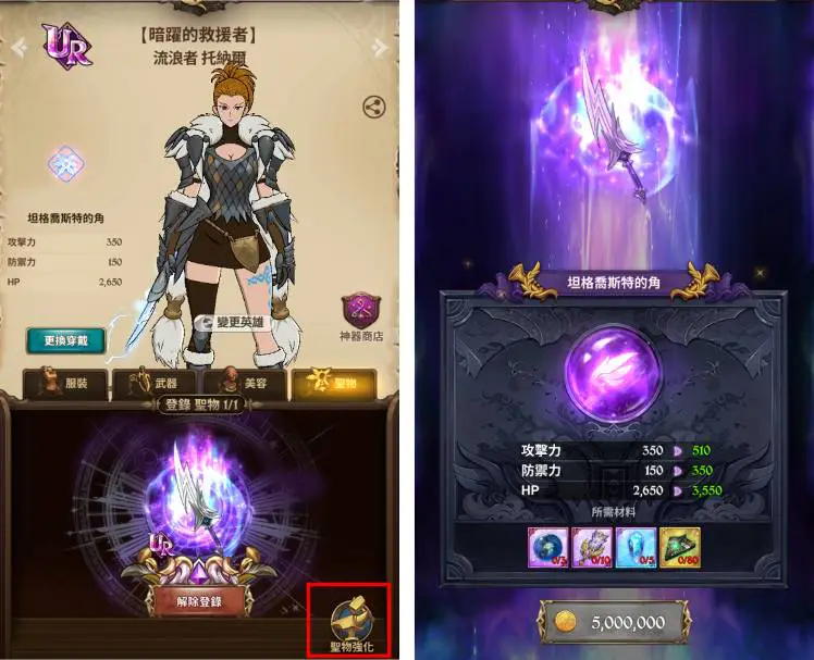 - 持有聖物的英雄,透過英雄[衣櫃] - [聖物]畫面內右下方的[聖物強化]可以進行聖物強化。