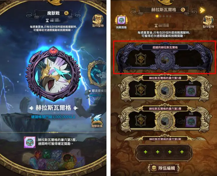 - 通關'赫拉斯瓦爾格的巢穴'第3層關卡後,即可挑戰'超越的赫拉斯瓦爾格'。