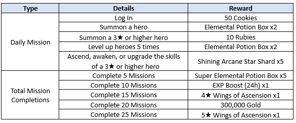 - Daily Mission rewards can only be claimed once per day and will be sent directly to the mailbox.