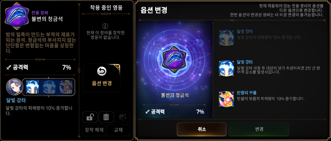 - 英雄正在配戴的專屬裝備,若進行變更屬性時,會自動卸下該裝備。