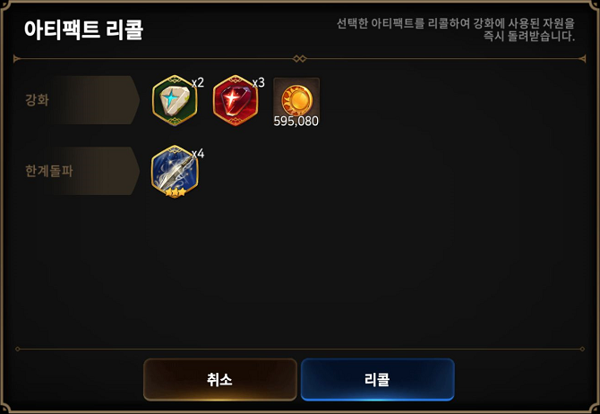 - 返還的金幣是用使用強化石進行強化返還的神器時所消耗的金幣來計算的。