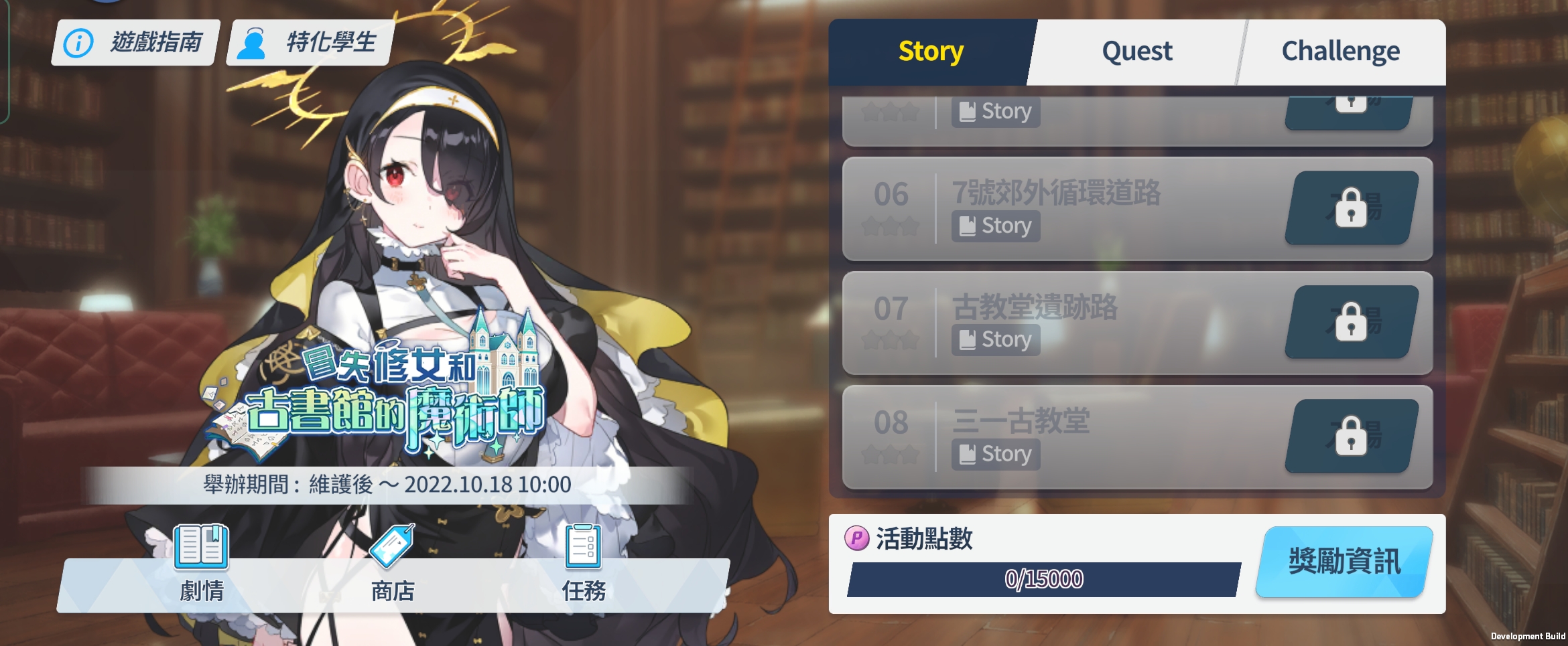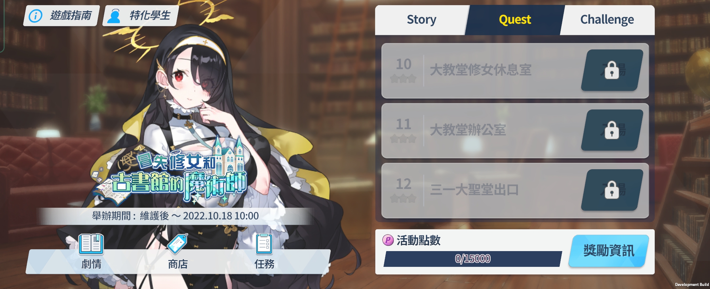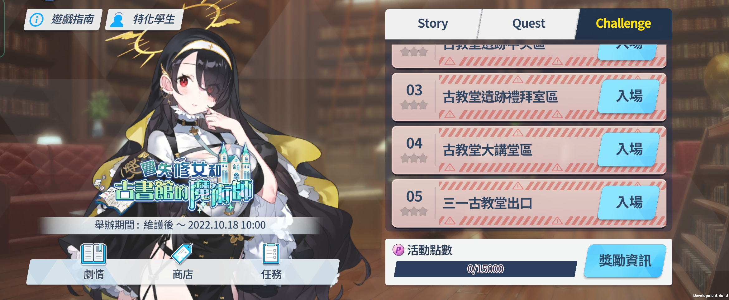 - 完成任務Normal 2-3即可進行「冒失修女和古書館的魔術師」Story、Quest與Challenge,