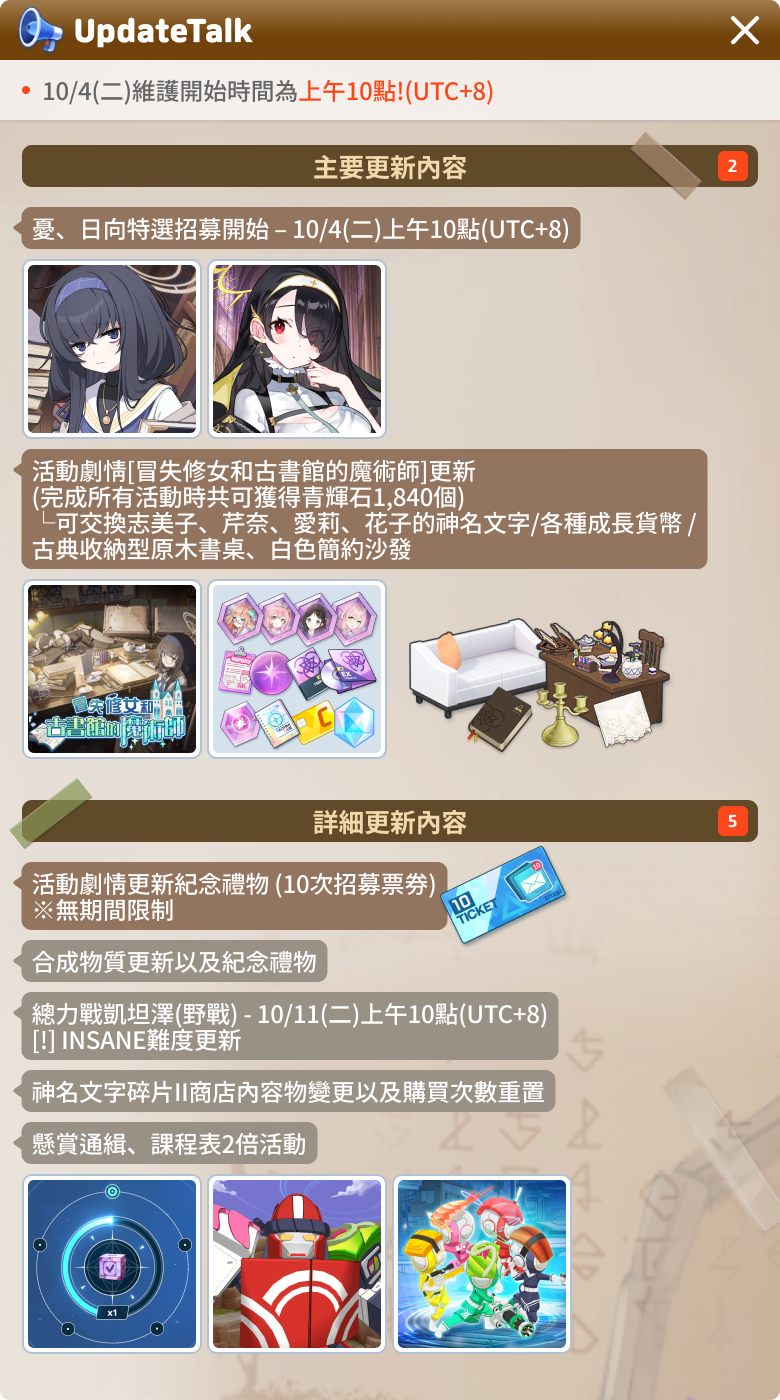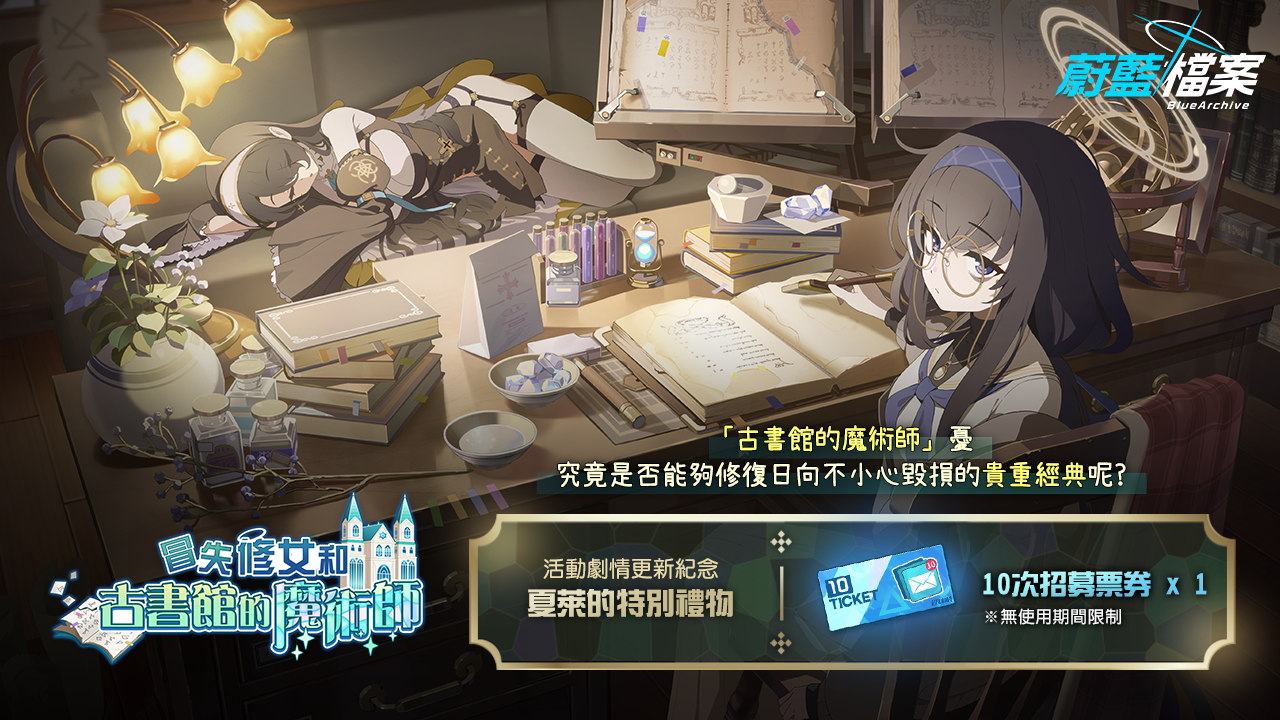 * 將發送10/4(二)冒失修女和古書館的魔術師活動劇情更新紀念感謝禮物[10次招募票券]1張。