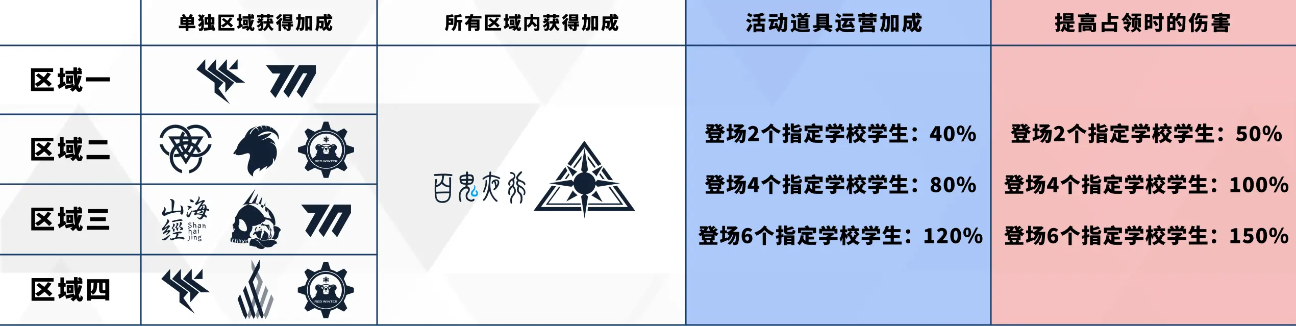 和之前的活动不同,本次活动没有指定的加成学生,转而变成了区域指定的多个学院上场人数,活动道具的最大加成为120%