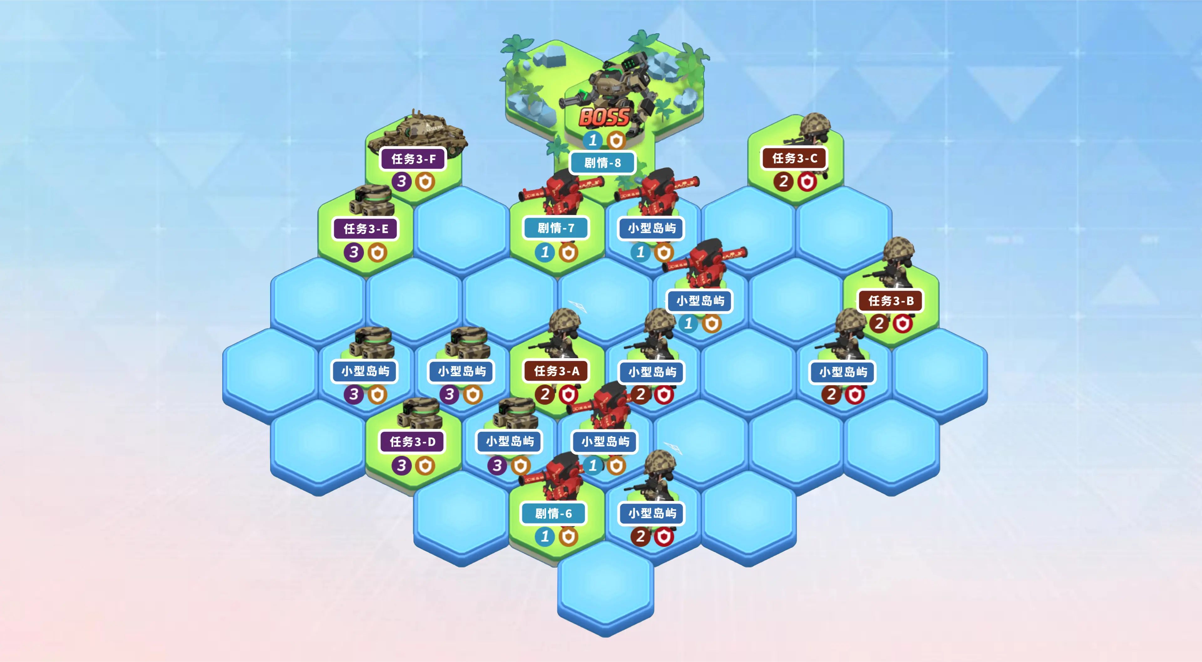 区域BOSS都会被红色的屏障保护,只有棋盘上相对应编号的敌人全部被击倒后才可进行挑战