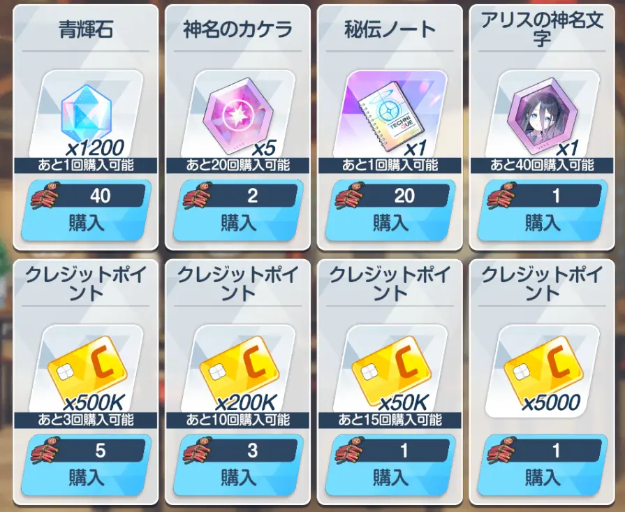 ![]() | 1200钻 必换 神名碎片 必换 秘传 必换 爱丽丝神名 可换可不换 出场几率几低 H本23-3可刷 500K信用 必换 200K信用 可换 50K信用 可换 5000信用 活动最后清空用 |