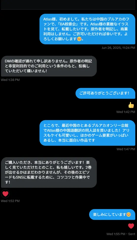 在6月1日的嘉兴bao上,鸠三样在“萌血殿”的摊位上看到了老师的汉化同人志,当时并没有认出来,念在支持同行,鸠三样二话不说便买了下来。过了几天,鸠三样向在关注列表里吃灰的老师发授权请求书的时候,无意间翻到了老师这本同人志的封面!?地球真小~