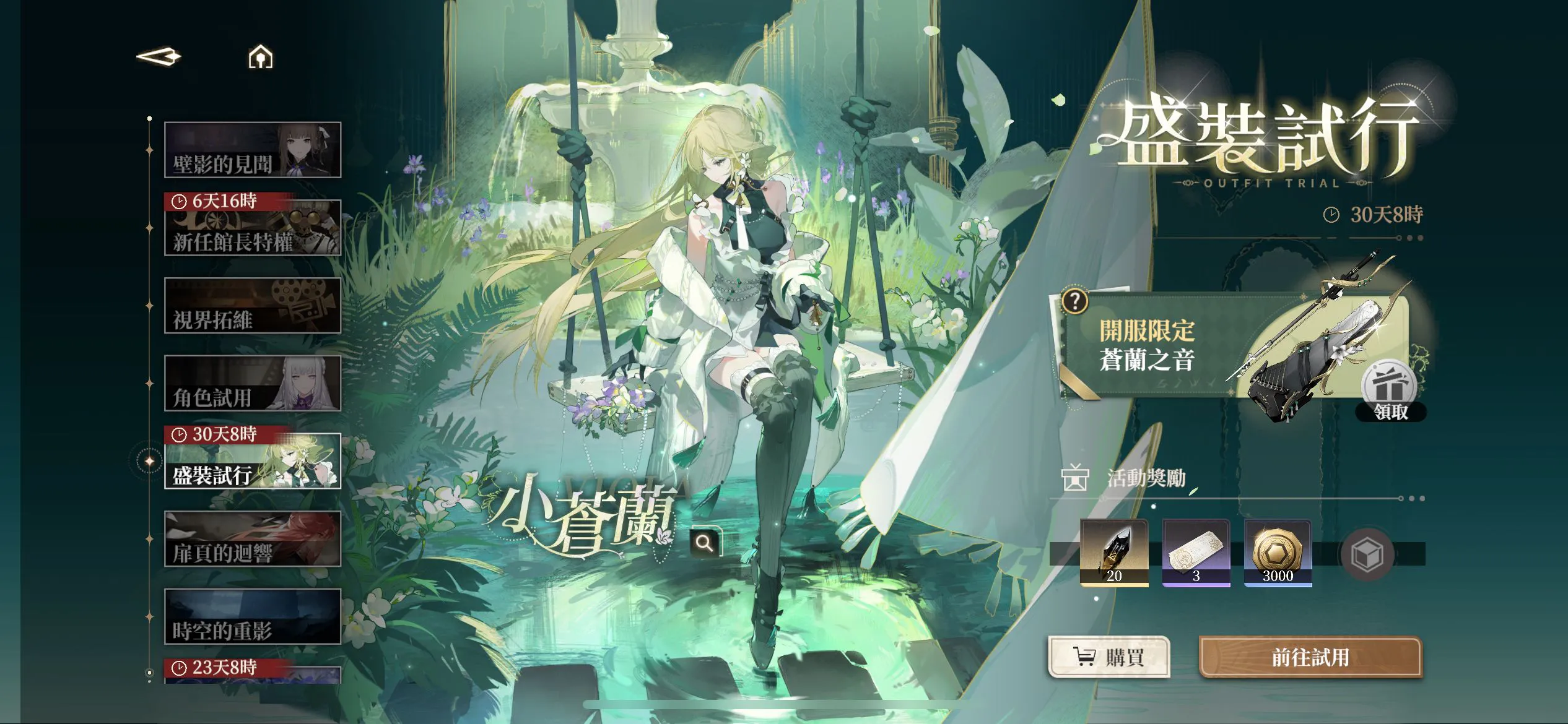 玩家点击前往使用后通关试用关卡,即可领取开服限定的薇奥拉的武器时装:苍兰之音