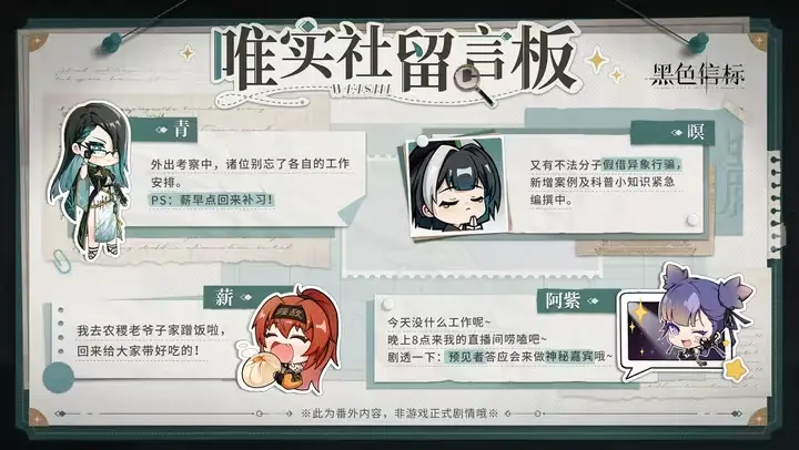 ▶离开图书馆后,安啾跟随预见者和零来到了乾 ▶离开图书馆后,安啾跟随预见者和零来到了乾 ※见识了乾人民美好的精神状态! 让本小鸟看看唯实社成员们都在留言板上写了什么吧—— —— 欢迎来到世界的背面,预 见 者 ——