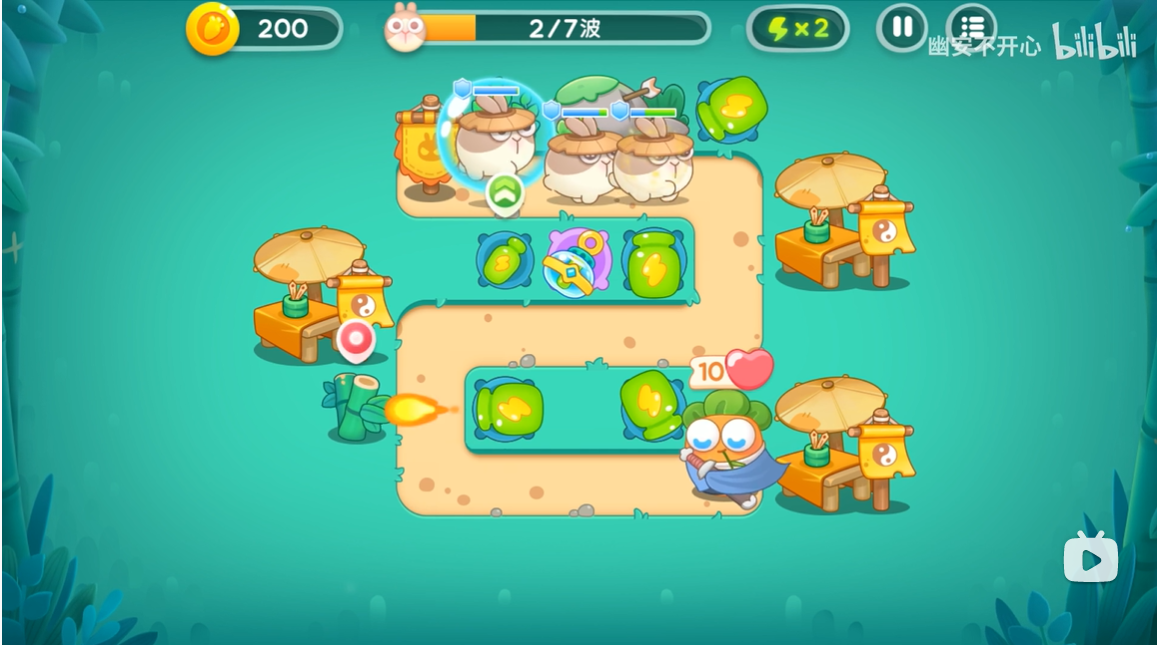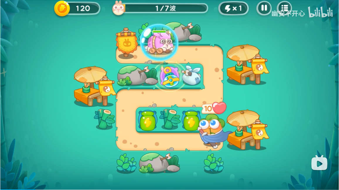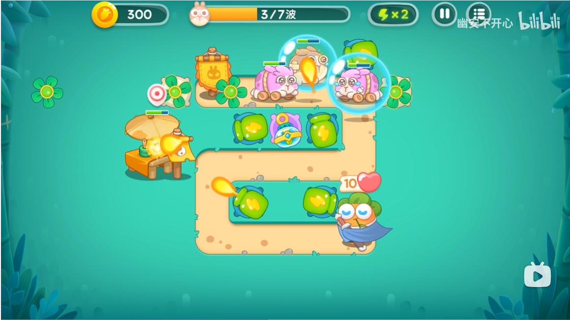 本关首先将会接触一个新的炮塔--泡泡塔,能够吐出泡泡包裹移动速度快的敌人对其进行减速,后期可以考虑建立在炮塔火力中间增加输出时间。(泡泡塔不能攻击物品只能攻击敌人,请注意!)