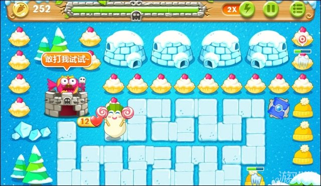 1、本关我摸可以选择使用一个冰锥炮塔卡ujuzai如图位置上建造一个冰锥炮塔,然后一开始就锁定上方的彩色蛋糕道具进行清除,清除完成后,我们会找到本关的爆破炸弹;