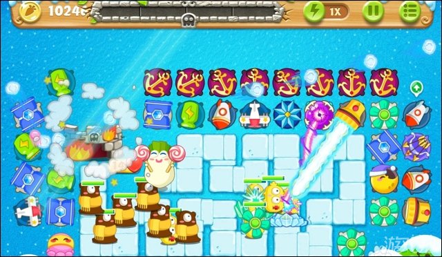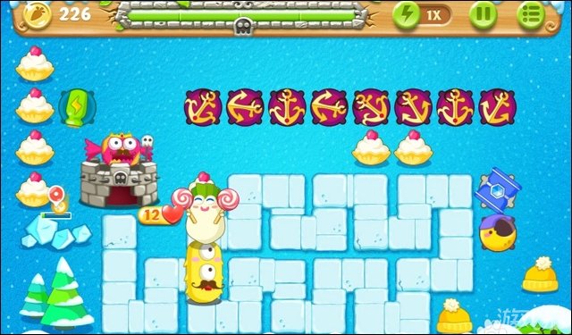 2、当我们找到爆破炸弹后,炸弹会将附近的道具全部清除,然后我们可以利用隐藏在道具中的船锚炮塔来清除剩下的雪屋即可,有钱就将上方的船锚炮塔一次升级至满级,然后再左侧建造一个瓶子炮塔开始清除左侧的蛋糕;