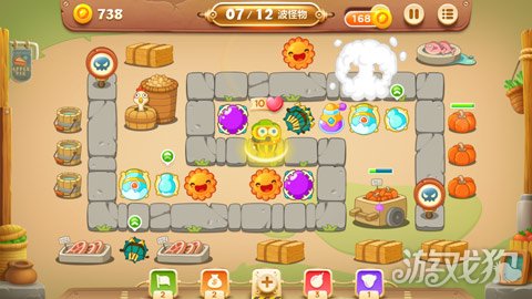 金币足够的时候放上魔法球增加攻击力。下图的雪球是隐藏关卡,免费得到的。优先升级雪球,可以减速