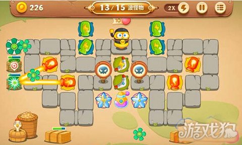 在图上圈圈的位置放上冰冻星减速,可以让小怪一直保持减速的效果。本关的怪物血量还是比较厚的,属于比较难的地方。