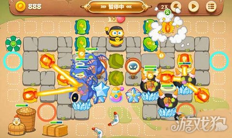 接着放冰冻星来减速,在两个出口的中间位置放毒气桶和回旋镖这种范围攻击的炮塔,可以同时攻击两边的小怪。