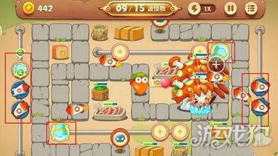 到了前中期我们的金币足够做到上面的阵容,红色区域炮塔的建立和升级最为重要。