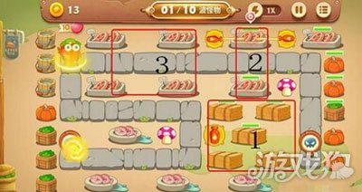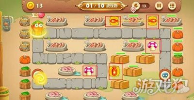 1.下面就是我们这关的地图,小编选择了用汽油瓶来攻击障碍物,蘑菇用来减速。