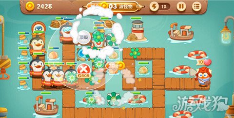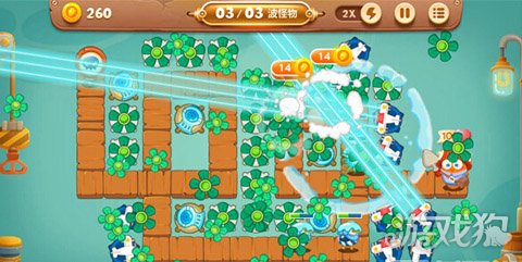 因为小怪很多,风扇可以分散攻击,顺便清理障碍物,所以开始的时候用它来开局,接着金币足够的时候在中间的位置放上雪球来减速,这个很重要,减速很重要的。