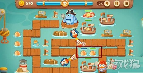 在关卡中是隐藏着塔炮的,我们现在大boss的中间放置两个导弹,然后在怪物出现的空闲时机,一直攻击怪物下方位置的两个障碍物,这里面是隐藏着两个船锚的。当障碍物清除之后,船锚就会出现。
