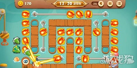 由于关卡的怪物比较的多,同时没有冰冻星等减速塔炮可以利用。所以就需要在中间的位置集中进攻。首先在上面与右侧的位置放置两个汽油瓶,同时的攻击中间的障碍。获得空间的时候,还可以获得大量的金币用来建造塔炮。