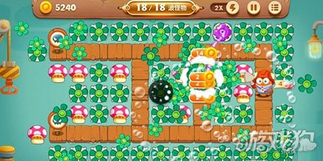 放置塔炮逐渐的清除障碍物,关卡中金币的数量就会逐渐的增多,同时中间的位置也出现了。在拐角的位置放置满级的蘑菇,因为蘑菇具有减速还有加金币的作用,是很重要的。建立塔炮的时候,两侧位置一定要对称平均,这样才可以同时消除双出口位置的小怪。