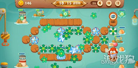 在怪物出现交叉口的位置放置冰冻星与风扇,冰冻星要满级,前期的怪物比较的简单,利用冰冻星就可以直接的杀死。后面的金币升级风扇,然后清除周边的障碍物。