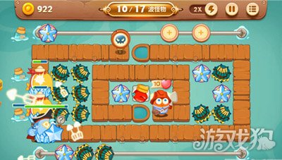 上图的红色框框里面的障碍物是隐藏的炮塔,一个冰冻星和拳套。开局先是一个冰冻星和多重箭,优先升到满级。