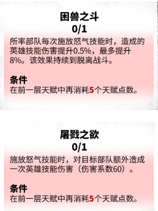 第三个点,对于最后大天赋技的选择,困兽是提升伤害,最高8%。屠戮是释放技能就有一次额外伤害,这里我建议选择屠戮增加额外伤害,还是那句话,法师是野战型兵种,困兽很明显的就是集结型天赋。野战拉扯咋可能刷满这么高的buff,平民玩家更是,就算你一直追人,反弹都快被反死了,还没加上几层buff,不如 屠戮直接伤害结算。