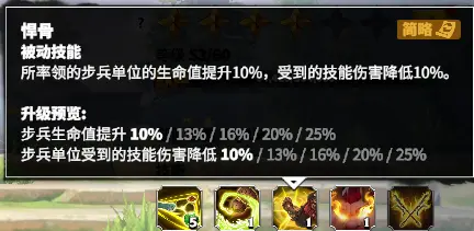 被动「To The Marrow」:步兵单位 HP+25%(满级)、技能伤害减免 25%(满级),大幅提升前排坦度,适配高血量步兵阵容(如重装步兵)。