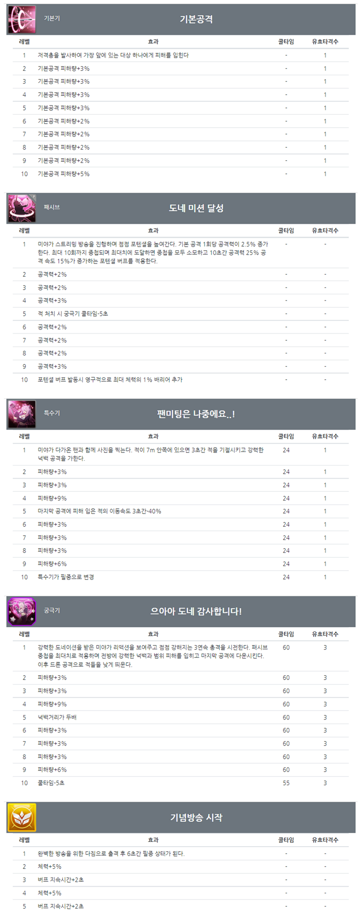 队长技:为了完美的放送而努力,出击后6秒间进入必中状态。 CD:-;有效打击数:- |