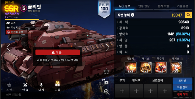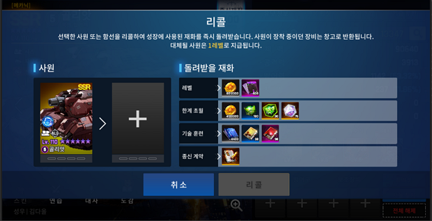 ※在召回对象中选择歌利亚时,可以获得最初获得状态的歌利亚和歌利亚消耗的成长材料。