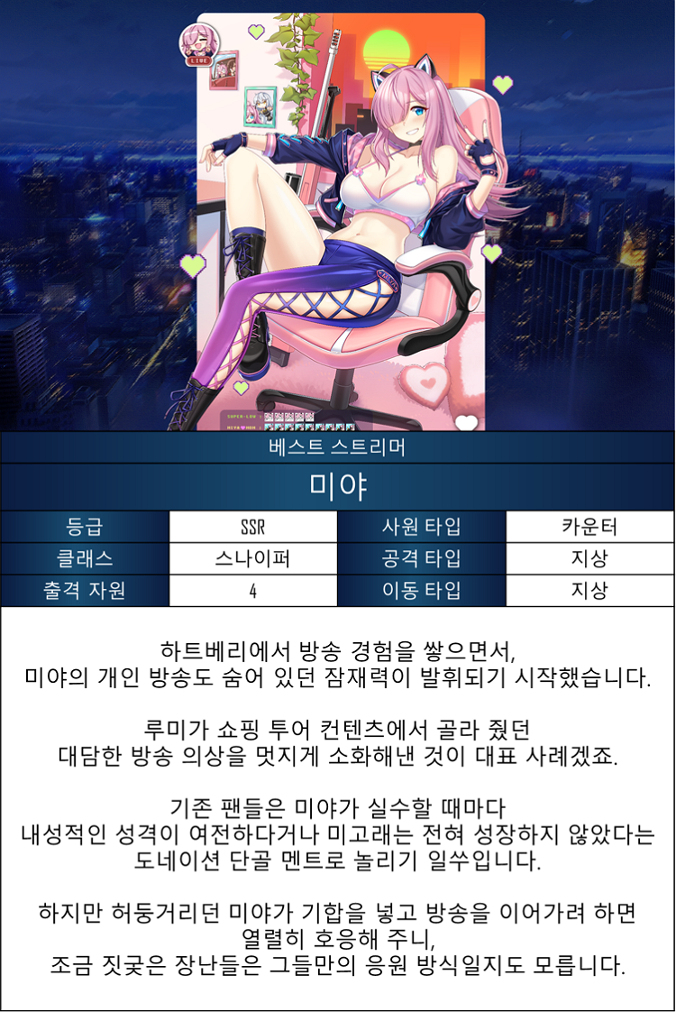 特殊技:米娅与靠近的粉丝一起合影。敌人在7m内时,3秒间使敌人眩晕,施加强力的击退攻击。 CD:24;有效打击数:1 |