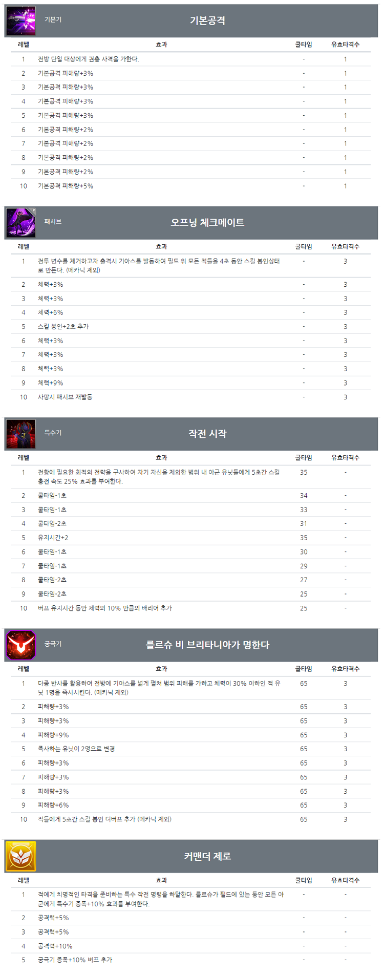 特殊技:根据战况运用最适合的战略,除自身外,范围内友军单位5秒间技能充能速度增加25% CD:35;有效打击数:- |