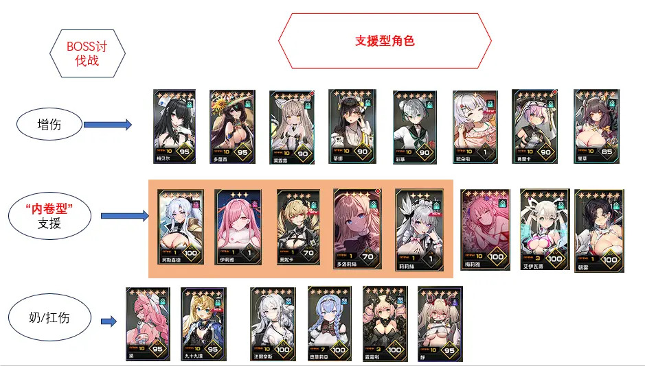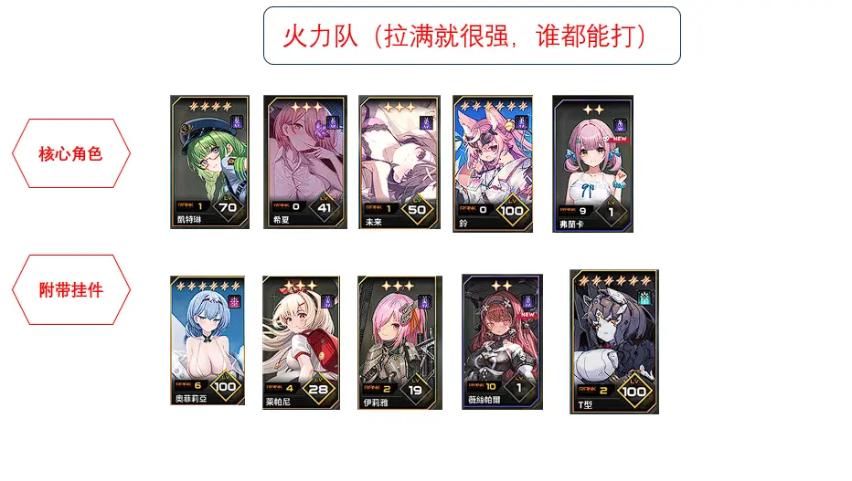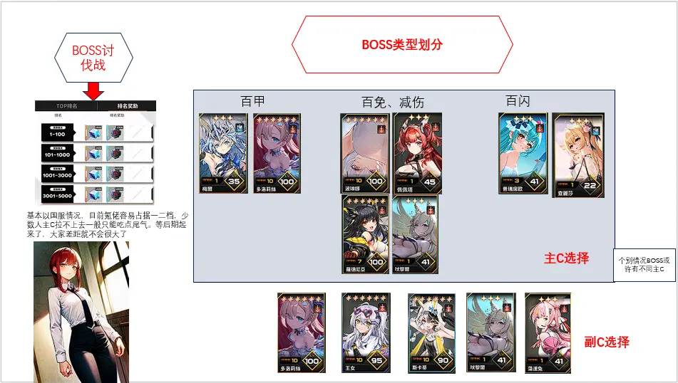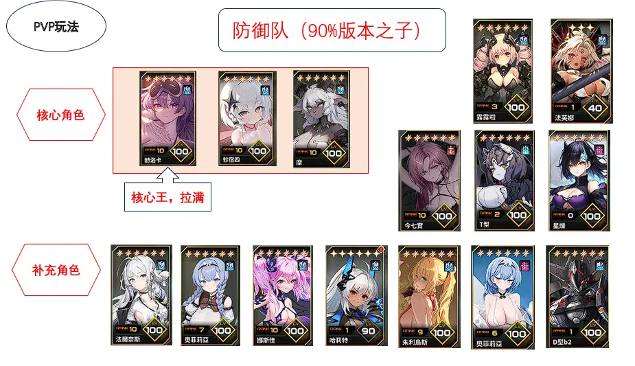 这次结合PPT图文讲解,正常游戏内容有PVP与PVE两种玩法,PVP分防御队、攻击队、火力队。PVE分推图与BOSS讨伐。接下来一一讲解。
